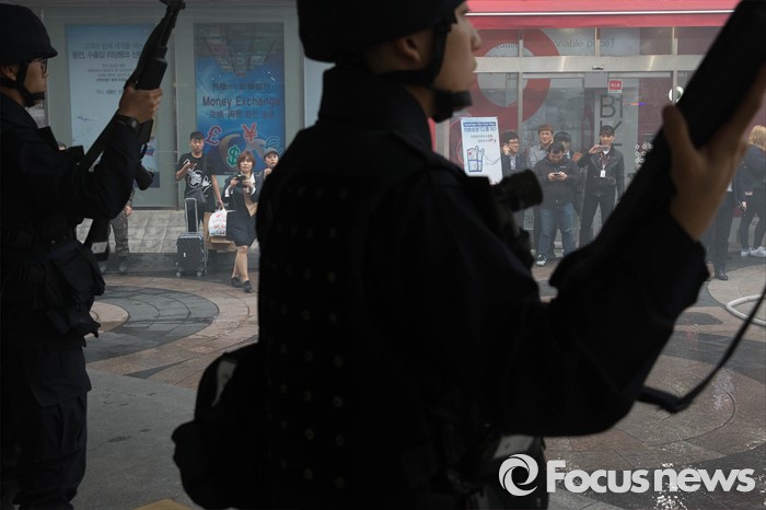 (서울=포커스뉴스) 21일 오후 서울 중구 명동예술극장에서 경찰특공대, 중부소방서, 218연대 등이 공연장 대테러훈련을 실시하고 있다.