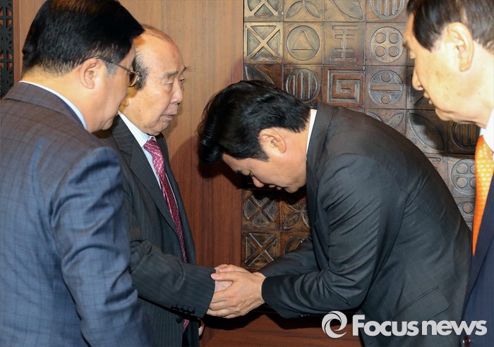 원 대행은 "지도부의 일원으로 저도 이자리에서 상임고문들에게 말씀드릴 입장이 아닌데 이렇게 이야기를 듣는 처지가 됐다"면서 "오늘 주신 말씀을 잘 새겨들어서 새누리당이 새롭게 거듭나고 박근혜정부 2기를 성공적으로 잘 마무리하겠다"고 덧붙였다.원유철(오른쪽 두번째) 새누리당 원내대표와 김수한(왼쪽 두번째) 전 국회의장이 21일 오후 서울 여의도 LG트윈타워의 한 중식당에서 상임고문단 오찬회에 참석해, 악수하고 있다. 2016.04.21 박철중 기자