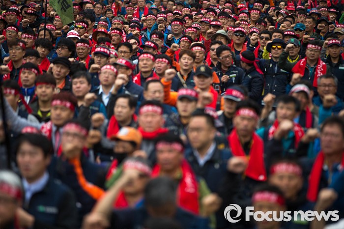 (서울=포커스뉴스) 21일 오후 서울역 앞에서 민주노총 전국건설노동조합 전국의 간부들이 건설노조 확대간부 결의대회를 열고 건설민생법안 통과를 촉구하는 집회를 하고 있다.