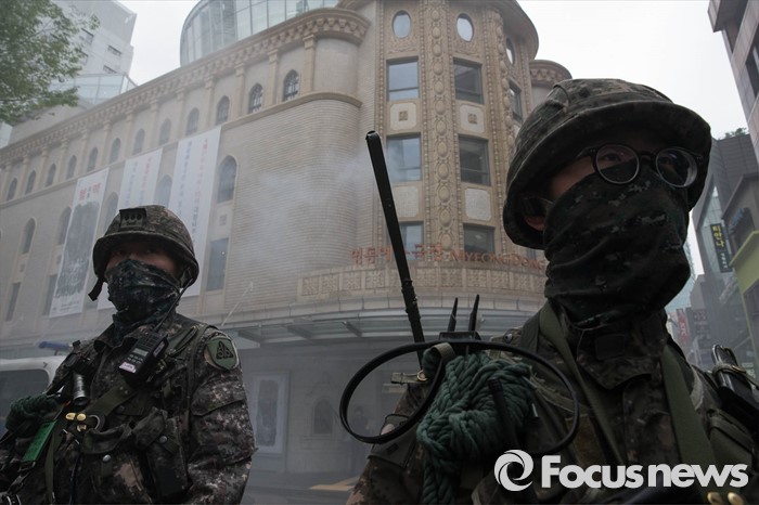 (서울=포커스뉴스) 21일 오후 서울 중구 명동예술극장에서 경찰특공대, 중부소방서, 218연대 등이 공연장 대테러훈련을 실시하고 있다.