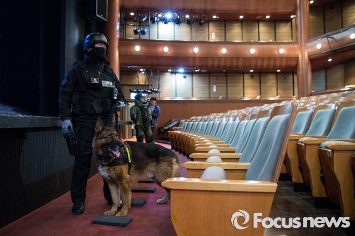 (서울=포커스뉴스) 21일 오후 서울 중구 명동예술극장에서 열린 대테러훈련에 참가한 경찰병력이 관객석에 폭발물을 탐지하고 있다.