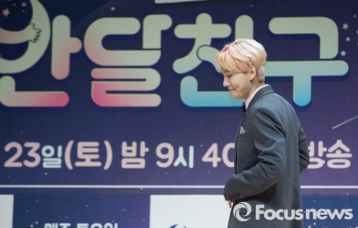 (서울=포커스뉴스) 21일 오후 서울 마포구 JTBC 사옥에서 열린 예능프로그램 '반달친구' 제작발표회에 참석한 아이돌 그룹 위너의 멤버 김진우가 포토타임을 위해 이동하고 있다.