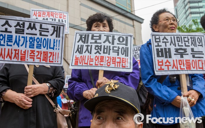 (서울=포커스뉴스) 최근 전경련의 차명계좌 자금 지원 의혹을 받고 있는 어버이연합 회원들이 21일 오후 서울 용산구 시사저널 사옥 앞에서 시사저널 규탄 기자회견을 하고 있다.