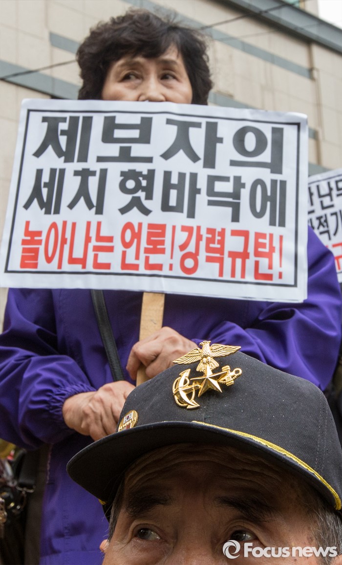 (서울=포커스뉴스) 최근 전경련의 차명계좌 자금 지원 의혹을 받고 있는 어버이연합 회원들이 21일 오후 서울 용산구 시사저널 사옥 앞에서 시사저널 규탄 기자회견을 하고 있다.
