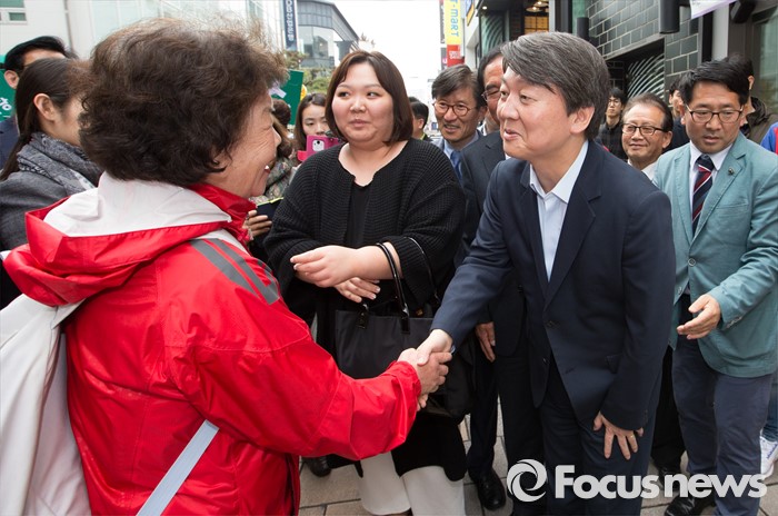 (청주=포커스뉴스) 안철수 국민의당 상임공동대표가 21일 오후 충북 청주 상당구 성안길을 찾아 시민들과 인사를 하고 있다. 안 대표는 4.13 국회의원선거에서 국민의당을 지지해준 것에 대한 감사의 뜻을 전했다.
