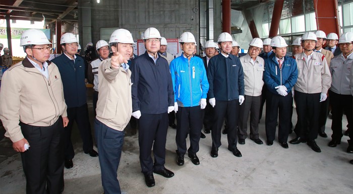 (서울=포커스뉴스) 이기권 고용노동부장관이 21일 오전 서울 송차구 잠실 제2롯제월드 120층 신축공사 건물에서 50대 건설업체 CEO가 참석하는 건설업 안전보건리더 회의에서 '재해예방 공동협력 선언문'을 채택후 건설현장을 둘러보고 있다. <사진제공=고용노동부>