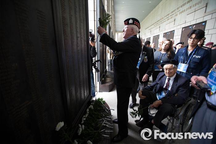 (서울=포커스뉴스) 임진강 및 가평전투 65주년을 맞은 21일 오후 서울 용산구 전쟁기념관에 6.25전쟁에 참전했던 영연방(영국, 캐나다, 호주, 뉴질랜드) 참전용사들이 방문해 유엔(UN) 참전국 전사자 명비를 사진찍고 있다.