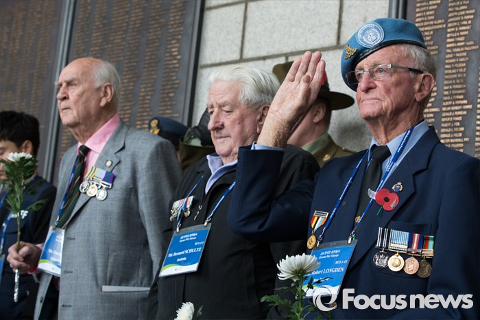 (서울=포커스뉴스) 임진강 및 가평전투 65주년을 맞은 21일 오후 서울 용산구 전쟁기념관에서 6.25전쟁에 참전했던 영연방(영국, 캐나다, 호주, 뉴질랜드) 참전용사들이 묵념과 경례를 하고 있다.