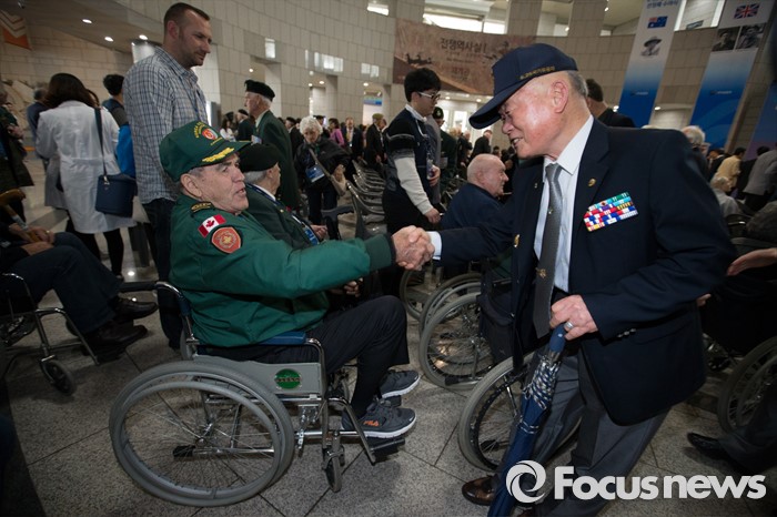 (서울=포커스뉴스) 21일 오후 서울 용산구 전쟁기념관에서 열린 6.25 전쟁영웅 선정패 수여식이 끝나고 영연방 참전용사들과 한국군 참전용사가 인사를 나누고 있다.