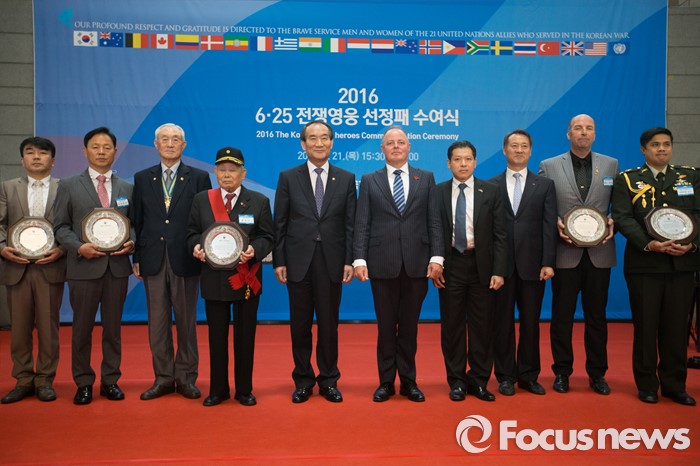 (서울=포커스뉴스) 21일 오후 서울 용산구 전쟁기념관에서 열린 6.25 전쟁영웅 선정패 수여식에서 박승춘(왼쪽부터 다섯번째) 국가보훈처장과 참전용사 및 가족들이 기념촬영을 하고 있다.