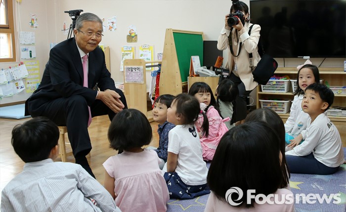 (서울=포커스뉴스) 김종인 더불어민주당 비대위 대표가 22일 오전 서울 여의도 국회 제3어린이집을 방문해, 어린이들과 인사를 하고 있다.