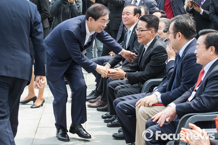 (서울=포커스뉴스) 22일 오전 서울 광화문 광장에서 열린 '2016 광주·전남 귀농귀촌 박람회'에서 박원순 서울시장과 박지원 국민의당 의원이 악수를 하고 있다.