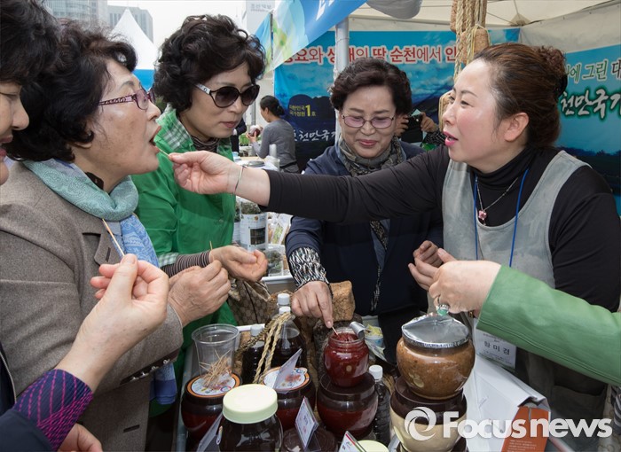 (서울=포커스뉴스) 22일 오전 서울 광화문 광장에서 열린 '2016 광주·전남 귀농귀촌 박람회' 순천시 부스에서 참석자들이 된장, 고추장을 비롯한 다양한 상품들을 시식하고 있다.