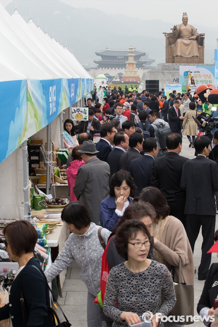 (서울=포커스뉴스) 22일 오전 서울 광화문 광장에서 열린 '2016 광주·전남 귀농귀촌 박람회'에서 시민들을 비롯한 참석자들이 다양한 상품들을 살펴보고 있다.