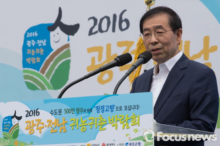 (서울=포커스뉴스) 22일 오전 서울 광화문 광장에서 열린 '2016 광주·전남 귀농귀촌 박람회'에서 박원순 서울시장이 축사를 하고 있다.