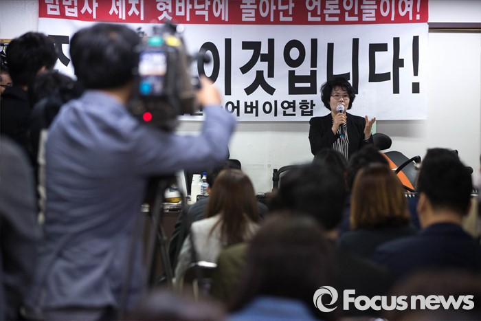 (서울=포커스뉴스) 김미화 자유민연합 대표가 22일 오전 서울 종로구에 위치한 어버이연합 사무실에서 기자회견을 하고 있다. 전경련에서 자금지원을 받은 의혹으로 논란에 휩싸인 어버이연합은 이날 기자회견을 열고 언론에 보도된 어버이연합 관련 기사들에 반박했다.