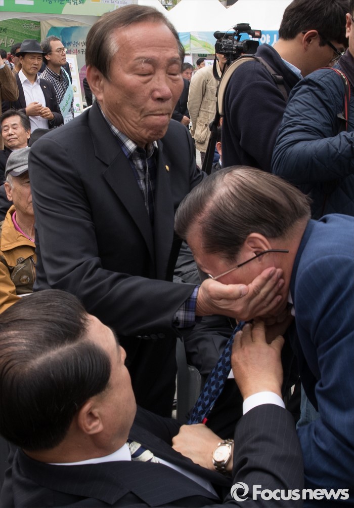 (서울=포커스뉴스) 22일 오전 서울 광화문 광장에서 열린 '2016 광주·전남 귀농귀촌 박람회'에서 오명준(오른쪽) 장흥군향우회장과 한 시민이 몸싸움을 하고 있다.