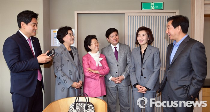 (서울=포커스뉴스) 새누리당 20대 총선 서울 지역 당선인들이 22일 오후 서울 여의도 한 일식집에서 오찬 모임에 앞서 대화를 하고 있다. 왼쪽부터 오신환, 이혜훈, 이은재, 지상욱, 나경원, 김성태 당선인.