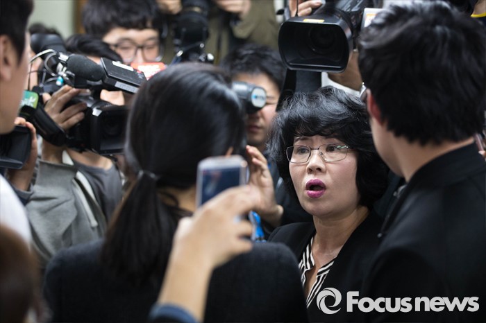 (서울=포커스뉴스) 김미화 자유민연합 대표가 22일 오전 서울 종로구에 위치한 어버이연합 사무실에서 기자회견을 끝내고 취재진의 질문에 답변 거부의사를 밝혀 실랑이를 벌이고 있다. 전경련에서 자금지원을 받은 의혹으로 논란에 휩싸인 어버이연합은 이날 기자회견을 열고 언론에 보도된 어버이연합 관련 기사들에 반박했다.