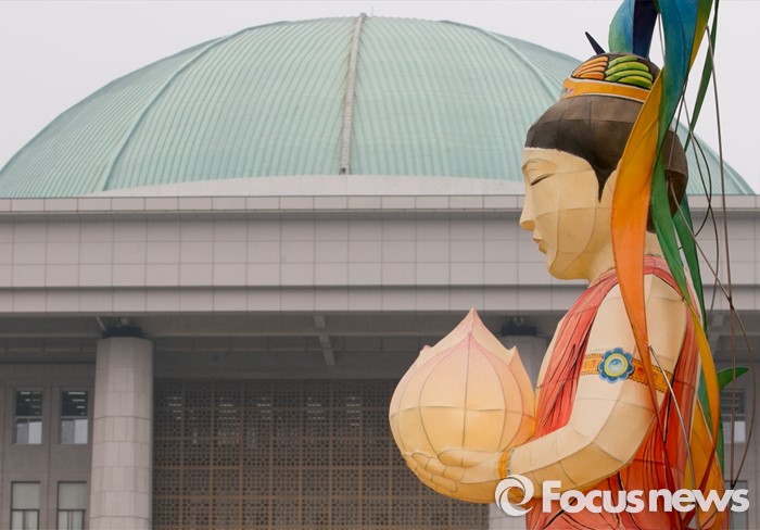 (서울=포커스뉴스) 석가탄신일을 3주 가량 앞둔 22일 오후 서울 여의도 국회 본청 앞 분수광장에 연등이 설치되어 있다.