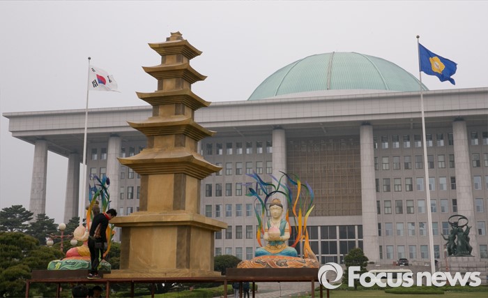 (서울=포커스뉴스) 석가탄신일을 3주 가량 앞둔 22일 오후 서울 여의도 국회 본청 앞 분수광장에 연등이 설치되어 있다.