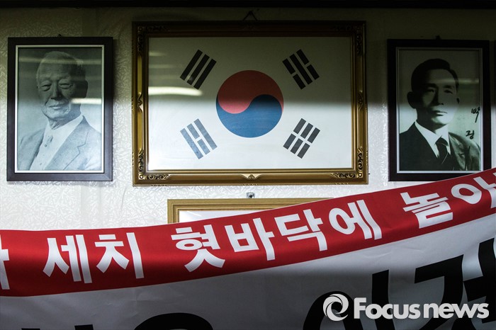 (서울=포커스뉴스) 전경련에서 자금지원을 받은 의혹으로 논란에 휩싸인 어버이연합이 22일 오전 서울 종로구에 위치한 어버이연합 사무실에서 기자회견을 시작하기 전 이승만-박정희 전 대통령 사진 앞으로 기자회견에 쓰일 플래카드를 설치하고 있다.