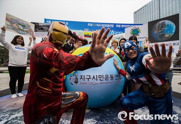 (서울=포커스뉴스) 22일 서울 종로구 광화문시민열린마당에서 지구시민운동연합 회원들이 제46회 지구의 날을 기념해 '나는 지구시민입니다'라는 주제로 플래시몹을 하고 있다.