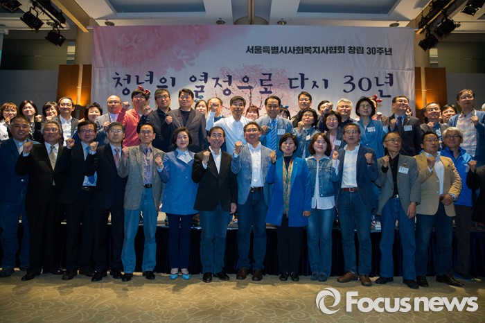 (서울=포커스뉴스) 22일 오후 서울 용산구 백범기념관에서 열린 사회복지사협의회 창립 30주년 기념행사에서 박원순 서울시장, 장재구 사회복지사협회 회장 및 사회복지사들이 기념촬영을 하고 있다.
