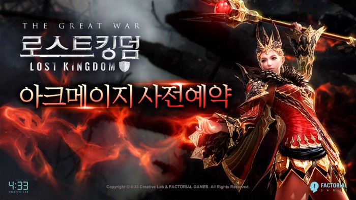 (서울=포커스뉴스) 네시삼십삼분(대표 장원상, 박영호, 이하 4:33)은 블록버스터 모바일게임 '로스트킹덤'(개발사 팩토리얼게임즈)의 3번째 캐릭터인 아크메이지 출시에 앞서 사전 예약 이벤트를 실시한다고 22일 밝혔다.