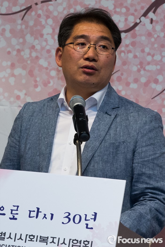 (서울=포커스뉴스) 22일 오후 서울 용산구 백범기념관에서 열린 사회복지사협의회 창립 30주년 기념행사에서 장재구 사회복지사협회 회장이 기념사를 하고 있다.
