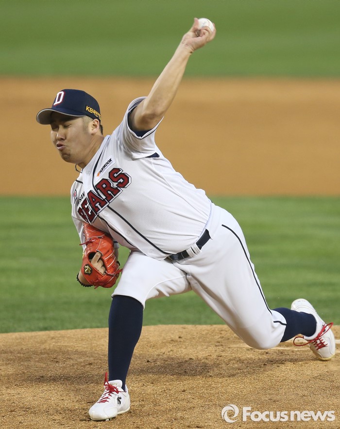 (서울=포커스뉴스) 22일 서울 잠실구장에서 열린 2016 프로야구 한화-두산 경기에서 1회초 두산 선발투수 유희관이 투구하고 있다.