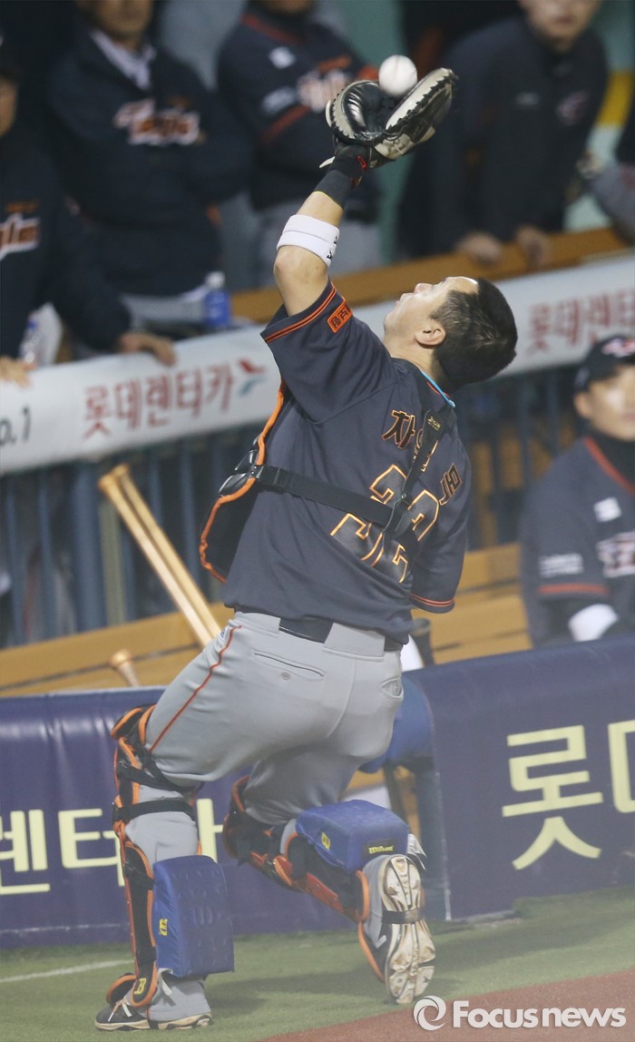 | △ 덕아웃 앞에서 뜬공 잡는 포수 차일목 |