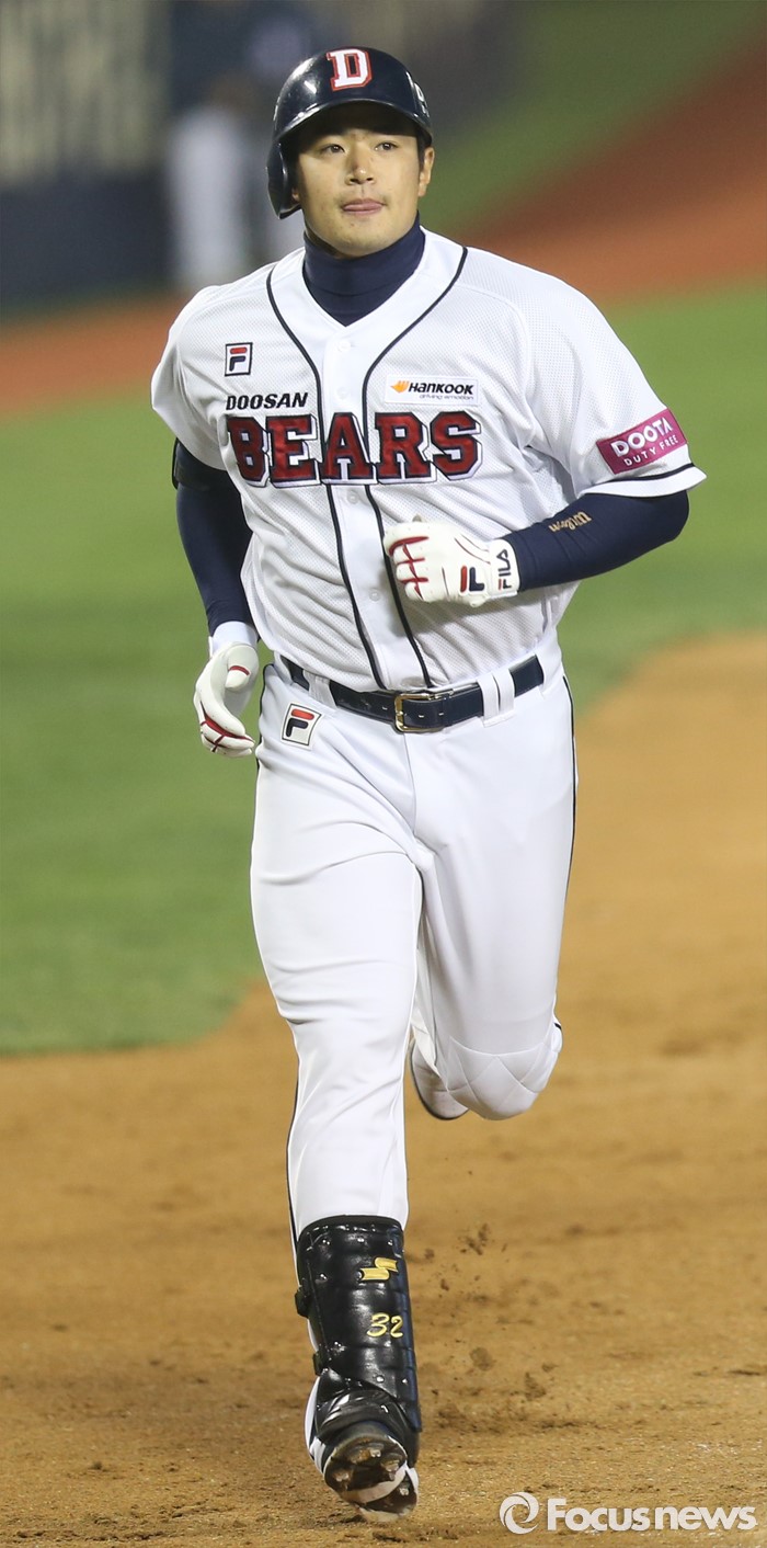 (서울=포커스뉴스) 22일 서울 잠실구장에서 열린 2016 프로야구 한화-두산 경기 7회말 1사후 두산 에반스의 대타로 나온 김재환이 한화 투수 이재우의 초구에 우월 만루 홈런을 치고 홈인하고 있다.