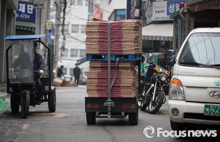 (서울=포커스뉴스) 세계 책의 날을 하루 앞둔 22일 오후 서울 중구 충무로 인쇄골목에서 인쇄 용지를 실은 삼륜차가 인쇄소를 향하고 있다.
