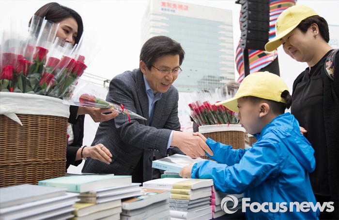 (서울=포커스뉴스)유네스코가 1995년 제정한 ‘세계 책과 저작권의 날’인 23일 오전 서울 중구 청계광장에서 열린 2016 세계 책의 날 기념 책드림 행사 '두근두근 책 속으로'에서 황교안 국무총리가 한 어린이에게 책과 꽃을 선물하며 인사를 건네고 있다.