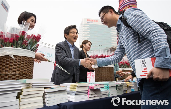 (서울=포커스뉴스)유네스코가 1995년 제정한 ‘세계 책과 저작권의 날’인 23일 오전 서울 중구 청계광장에서 열린 2016 세계 책의 날 기념 책드림 행사 '두근두근 책 속으로'에서 황교안 국무총리가 시민들에게 책과 꽃을 선물하며 인사하고 있다.