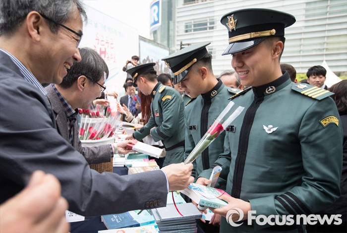 (서울=포커스뉴스)유네스코가 1995년 제정한 ‘세계 책과 저작권의 날’인 23일 오전 서울 중구 청계광장에서 열린 2016 세계 책의 날 기념 책드림 행사 '두근두근 책 속으로'에서 출판 관계자들이 장병들에게 책과 꽃을 나눠주고 있다.