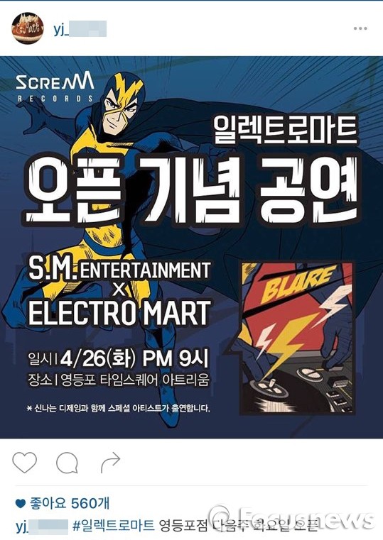 가전·완구·드론 체험존·피규어 전문존 등과 함께 남성 패션·스포츠·캠핑 등 편집형 매장을 대폭 확대해 일렉트로마트의 주 소비자층인 남성들을 겨냥했다.이마트는 일렉트로마트 3호점 영등포점 개장을 기념해, 26일 서울 영등포구 타임스퀘어 1층 아트리움에서 SM엔터테인먼트와 협업해 EDM 공연을 연다. 정용진 신세계그룹 부회장은 자신의 SNS에 공연 포스터를 미리 올리고 홍보에 나섰다.<사진출처=정용진 부회장 인스타그램>