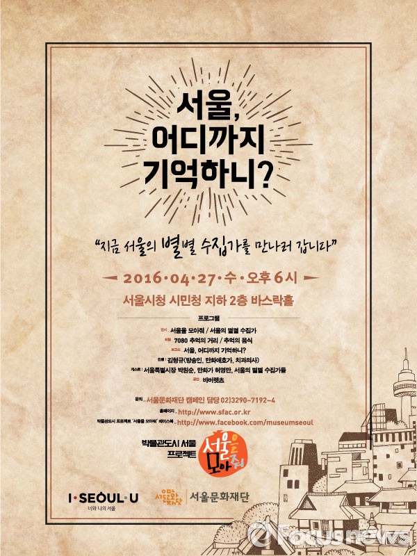 (서울=포커스뉴스) 서울문화재단은 '서울 어디까지 기억하니?'라는 주제의 네트워킹 행사를 오는 27일 오후 6시부터 서울시청 시민청 지하 2층 바스락홀에서 개최한다고 24일 밝혔다.