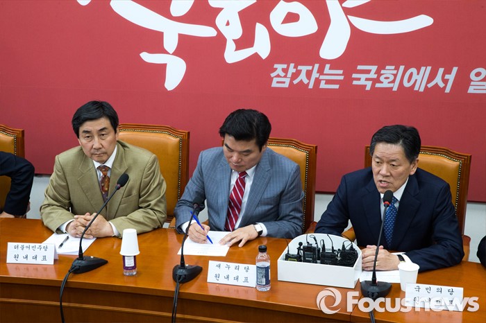 (서울=포커스뉴스) 이종걸 더불어민주당 원내대표가 24일 오후 서울 여의도 국회에서 열린 3당 원내대표 회담에 참석해 모두발언을 하고 있다.