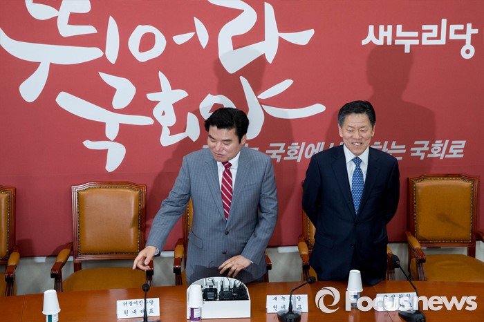 (서울=포커스뉴스) 원유철 새누리당 원내대표와 주승용 국민의당 원내대표가 24일 오후 서울 여의도 국회에서 열린 3당 원내대표 회동에서 약속 시간을 맞추지 못한 이종걸 더불어민주당 원내대표 자리를 가르키며 핀잔을 놓고 있다.