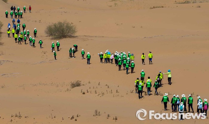 (다라더치/중국=포커스뉴스) 24일 오전 중국 내몽고 다라더치 쿠부치사막에서 한ㆍ중ㆍ일 대학생들로 구성된 2016 미래숲 15기 녹색봉사단원들이 사막트래킹을 하고 있다. 미래숲 녹색봉사단은 이번 봉사활동을 통해 황폐화된 사막에 나무 심기 및 각국 청년들과 우호를 증진을 위한 교류 활동을 전개할 예정이다.