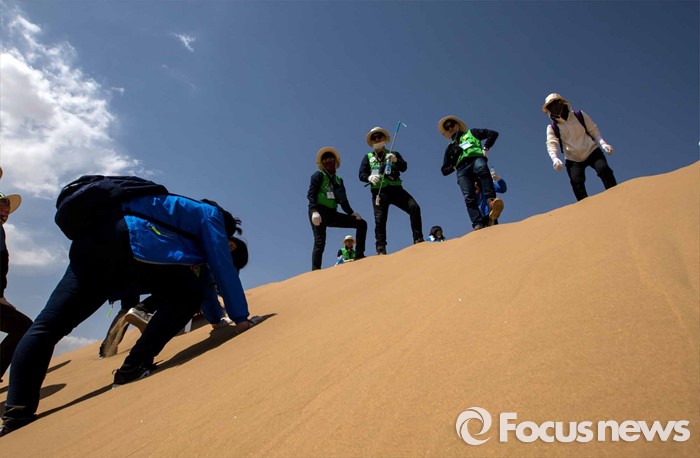 (다라더치/중국=포커스뉴스) 24일 오전 중국 내몽고 다라더치 쿠부치사막에서 한ㆍ중ㆍ일 대학생들로 구성된 2016 미래숲 15기 녹색봉사단원들이 사막트래킹을 하고 있다. 미래숲 녹색봉사단은 이번 봉사활동을 통해 황폐화된 사막에 나무 심기 및 각국 청년들과 우호를 증진을 위한 교류 활동을 전개할 예정이다.