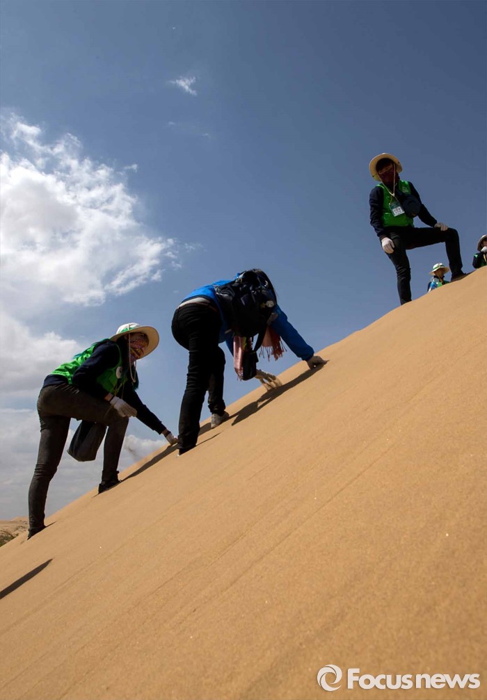 (다라더치/중국=포커스뉴스) 24일 오전 중국 내몽고 다라더치 쿠부치사막에서 한ㆍ중ㆍ일 대학생들로 구성된 2016 미래숲 15기 녹색봉사단원들이 사막트래킹을 하고 있다. 미래숲 녹색봉사단은 이번 봉사활동을 통해 황폐화된 사막에 나무 심기 및 각국 청년들과 우호를 증진을 위한 교류 활동을 전개할 예정이다.