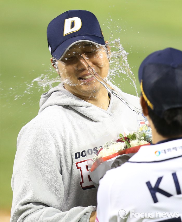 (서울=포커스뉴스) 24일 서울 잠실구장에서 열린 2016 프로야구 한화-두산 경기에서 두산 장원준이 승리 투수가 되며 통산 100승을 기록했다. 주장 김재호가 꽃다발과 함께 물세례로 축하하고 있다.