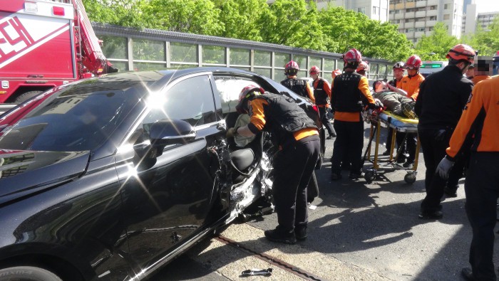이날 사고는 원효대교 남단에서 용산방향으로 가던 제네시스 차량이 중앙분리대를 들이받고 넘어가 아반떼 차량과 충돌하면서 발생했다.