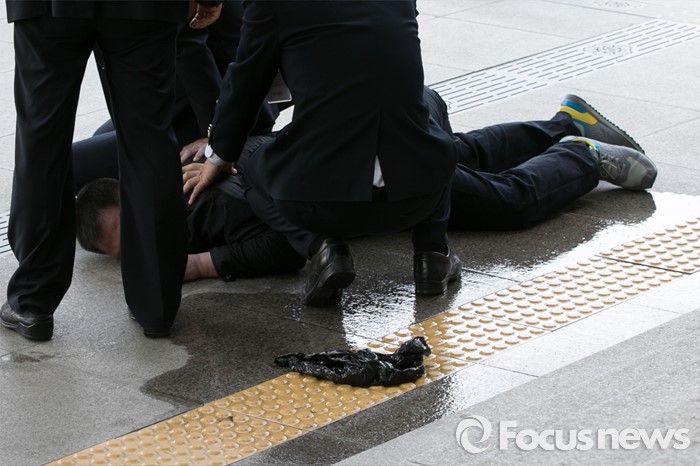(서울=포커스뉴스) 25일 오후 서울 여의도 국회 의원회관 앞에서 신원 미상의 한 중년 남성이 분신 시도를 하려다, 국회 방호원들에게 제압당하고 있다.