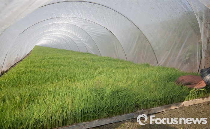 (파주=포커스뉴스) 25일 오전 경기도 파주시 오두산 인근 논밭에서 한 농부가 비닐하우스에 있는 벼들을 위해 공기를 환기시키고 있다.