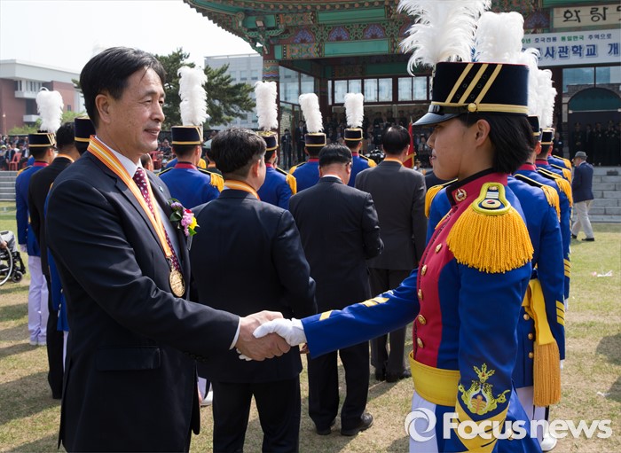 (서울=포커스뉴스) 29일 오후 서울 노원구 육군사관학교에서 열린 개교 70주년 기념식에서 한 생도가 아름다운 육사인 70인에 선정된 선배에게 메달 전달 후 악수하고 있다.
