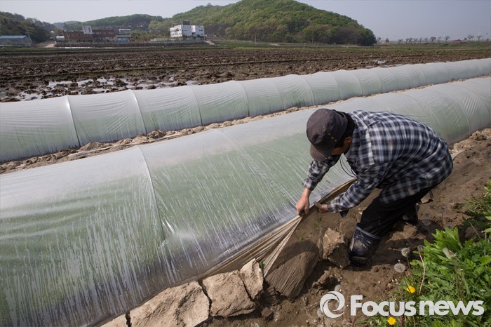 (파주=포커스뉴스) 25일 오전 경기도 파주시 오두산 인근 논밭에서 한 농부가 비닐하우스에 있는 벼들을 위해 공기를 환기시키고 있다.